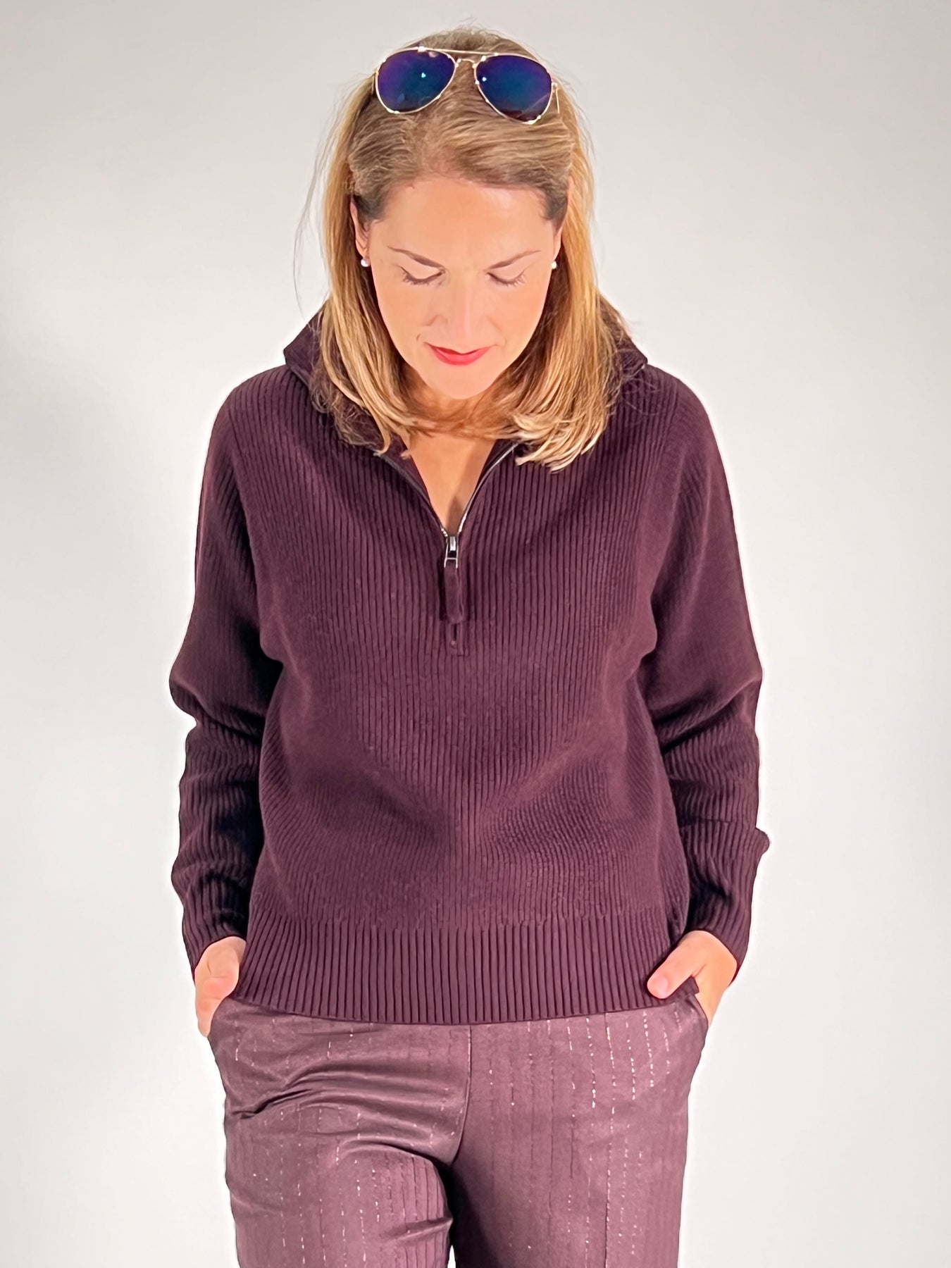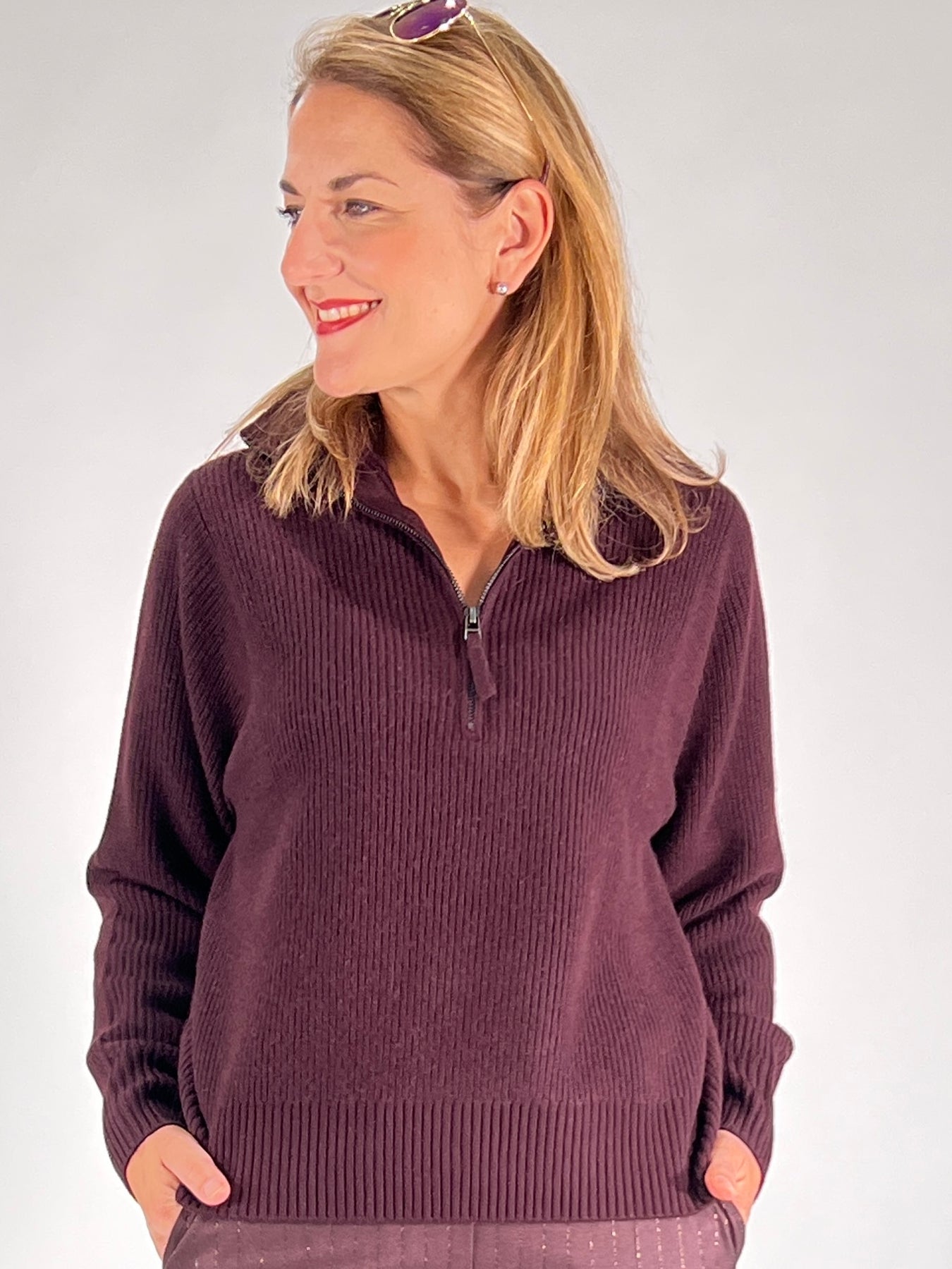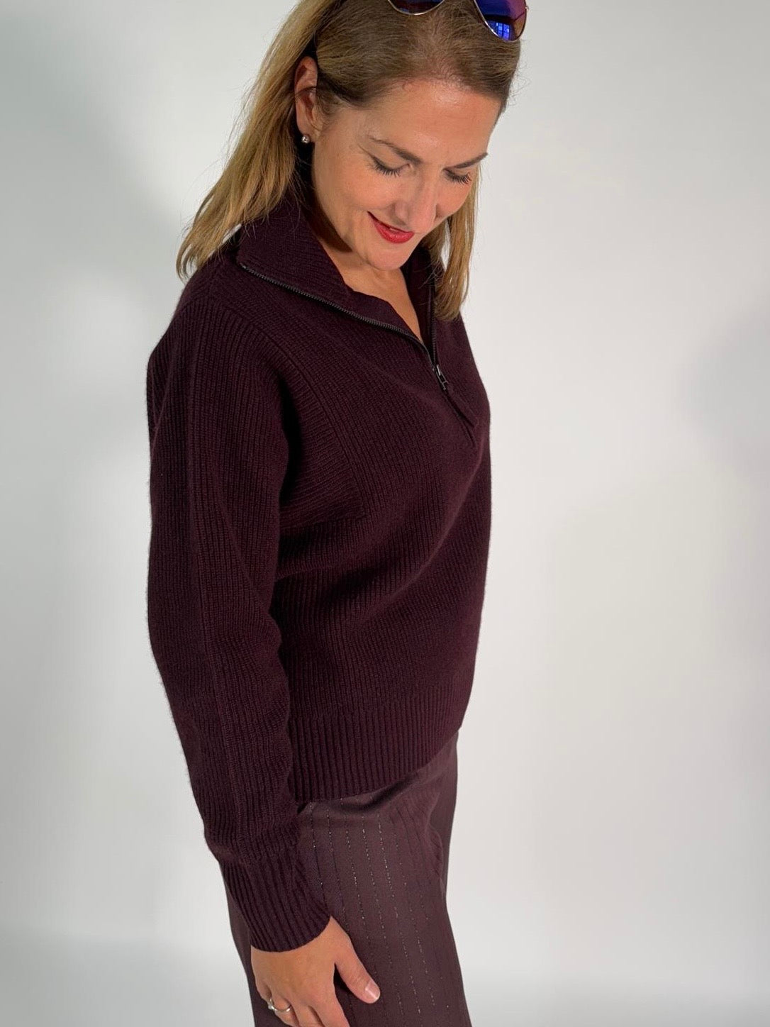 • Legerer Woll-Pullover im Ripp-Strick in einem tiefen rotbraunem Burgund