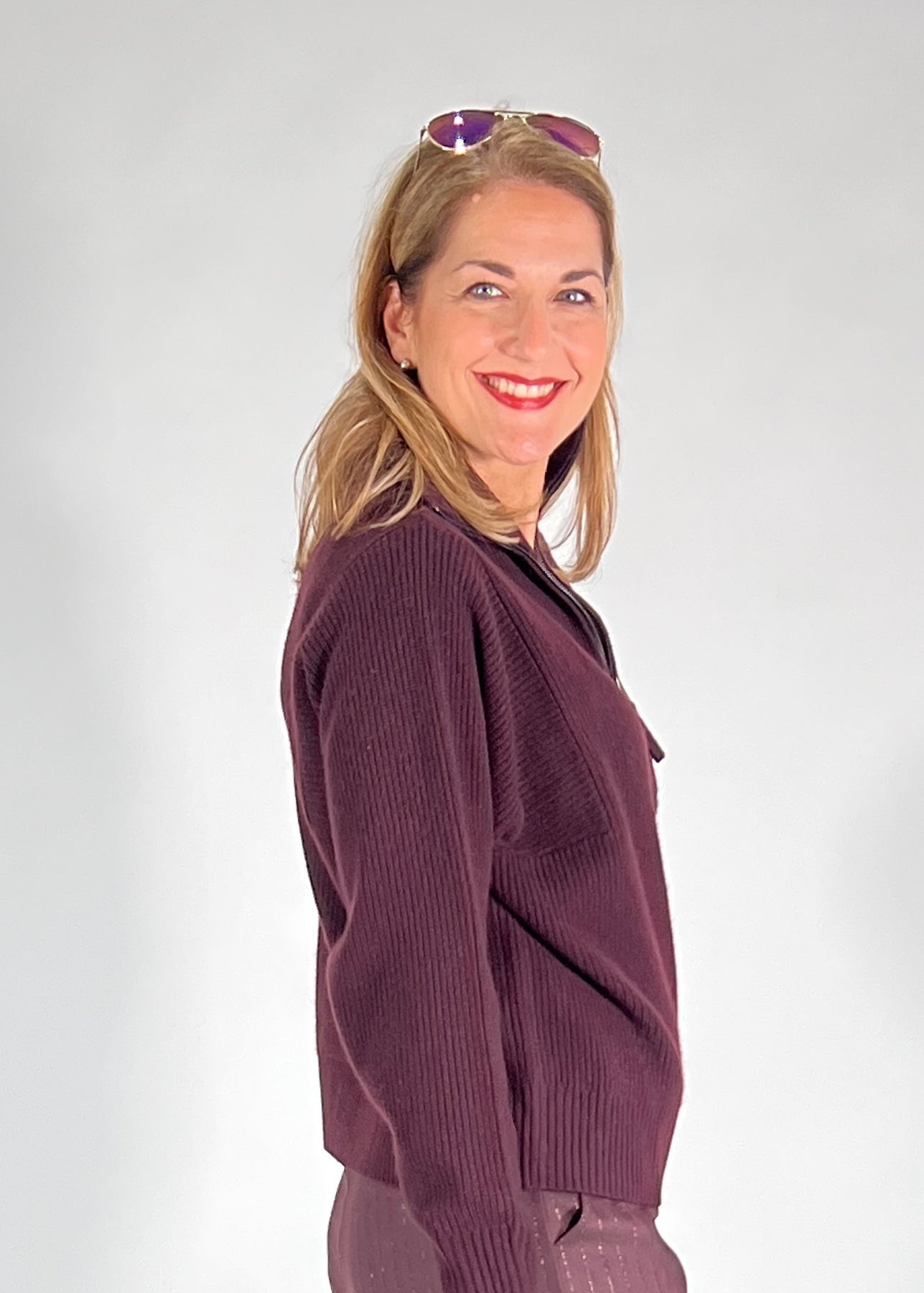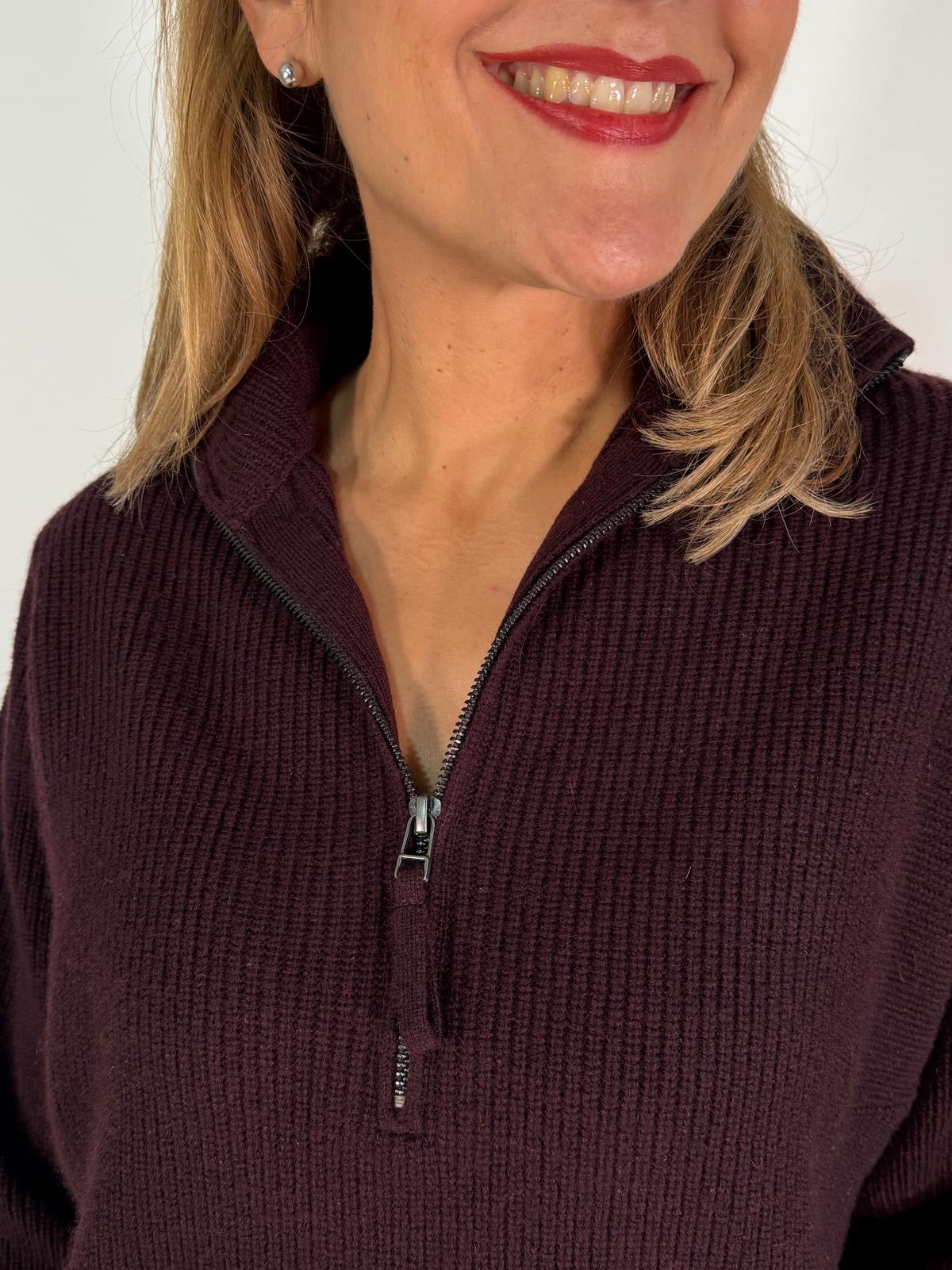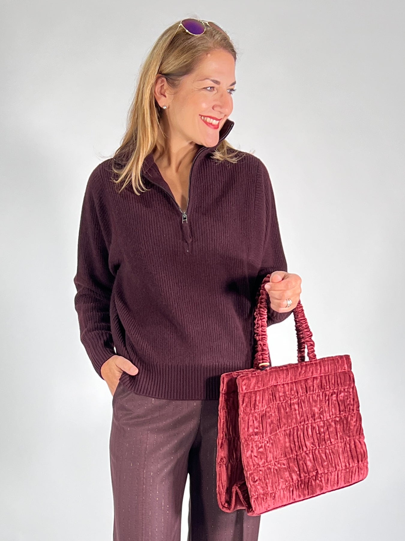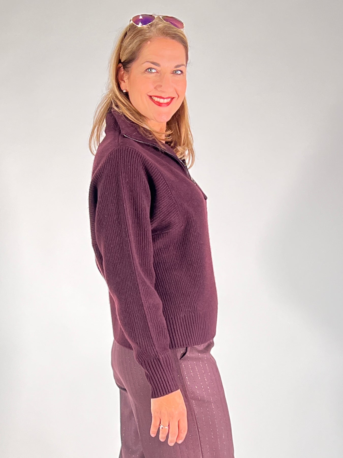 • Legerer Woll-Pullover im Ripp-Strick in einem tiefen rotbraunem Burgund